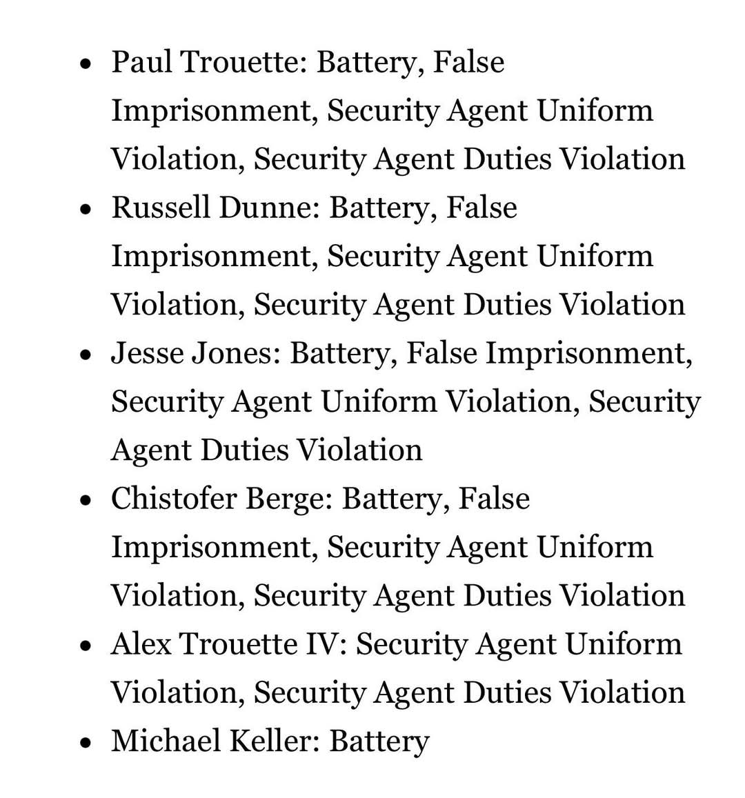 Paul Trouette, Russell Dunne, Christofer Berge and Jesse Jones were all charged with battery, false imprisonment, security agent uniform violation and security agent duties violation, according to the attorney's office.