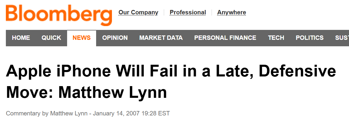 (127,681 posts)"Apple will sell a few to its fans, but the iPhone won't make a long-term mark on the industry."