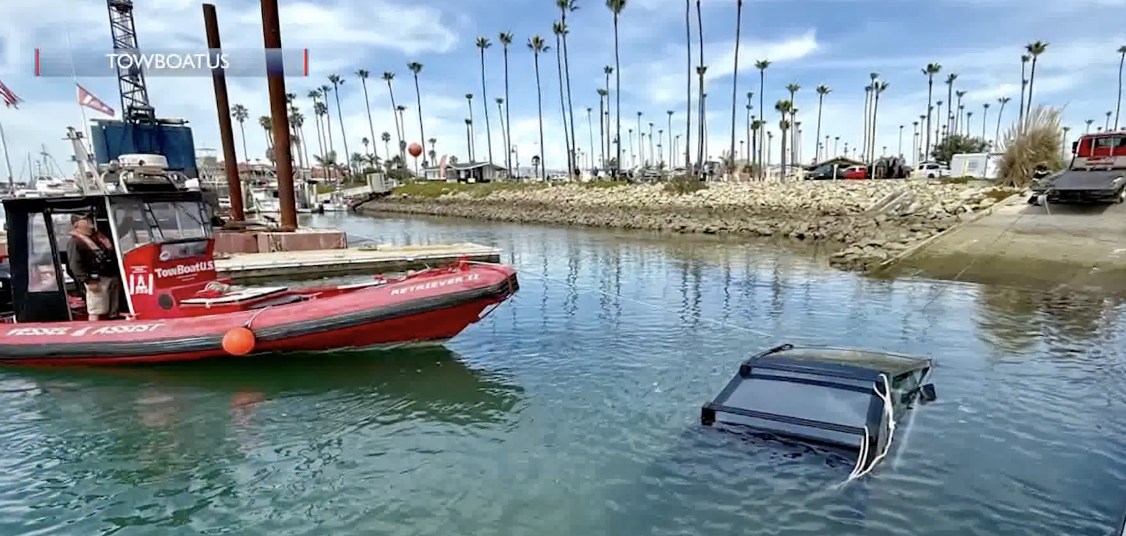 This Cybertruck took a dive while the driver was launching a jet ski in the Ventura Harbor Monday. TowboatUS assisted in the effort to bring it up and out.