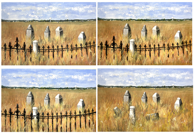 This was painted on water color paper I prepared with a layer of acrylic gesso so it wouldn't be so porous. After finishing the first one, which I posted here the other day, I decided I didn't like the distant water tower right in the middle, so I moved it to the right. Then I moved the white marker to the inside of the fence (in the reference photo it was outside the fence). Then I decided the fence made the painting too cluttered so I erased it and added a couple ruined gravestones. So, if you're working with gouache and don't like some part of your work, you can just erase bits by applying water carefully, dabbing it off and letting it dry. You can't do that with either water color or acrylics.