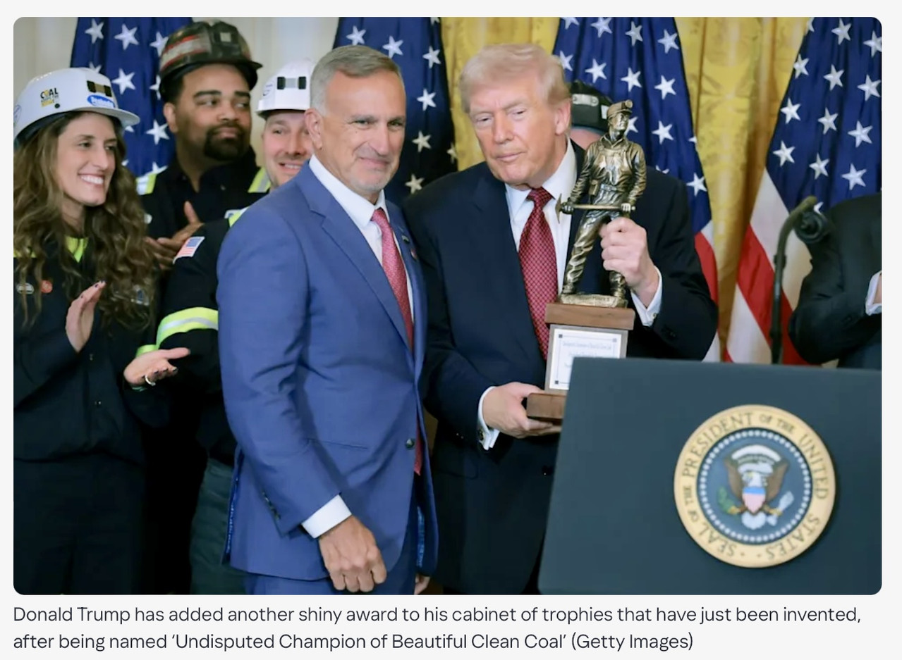 (18,015 posts)From the whitehouse.gov site: "Yesterday, President Donald J. Trump welcomed lawmakers, industry leaders, and hardworking miners from across the country to the White House Champion of Coal event. There, he signed an Executive Order directing the Department of War to purchase coal power, celebrated the Tennessee Valley Authoritys recommitment to coal, and was honored by coal miners as the Undisputed Champion of Beautiful, Clean Coal for his tireless leadership in ending the Radical Lefts war on the industry."