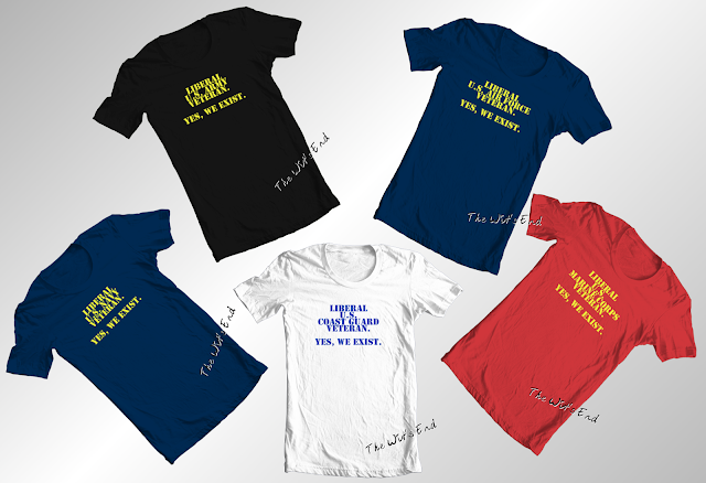 The Wit's End has liberal veteran tee shirts available. Many people are under the mistaken impression that the military is one giant block of conservatives. That is not true at all. Admittedly, the ratio is in favor of the conservative elements, but there are a significant number of progressive military servicemembers and veterans. Part of the problem is that the conservative members are more vocal, and get most of the attention. This leads to the more liberal elements keeping their mouths shut because they believe that they are hopelessly outnumbered. These tees help get the word out that they are not alone, there are other liberal veterans and one of them is standing right in front of them as they read the shirt.