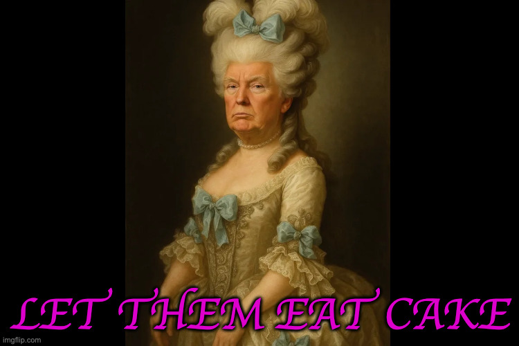Trump is literally telling starving Red State voters and other Americans to "eat cake" in his Marie Antoinette moment, as he spends $6 million of tax payer dollars to throw a Great Gatsby Halloween Bash at Mar-a-Lago, as Federal judges struggle to force his Administration to make $8 billion in SNAP food stamp payments to 42 million underprivileged households in America below the poverty line.